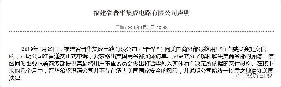 针对美国商务部对福建省晋华集成电路有限公司采取限制出口措施的决定,福建晋华于1月25日发布最新声明称,向美国商务部最终用户审查委员会提交信函,声明公司准备递交正式申诉,要求移出美国商务部实体清单。