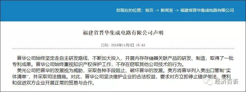 在2018年11月3日晚间,针对美国出口管制及美国司法部指控福建晋华和联华电子涉嫌窃取美光知识产权和商业机密事件,福建晋华正式回应称,不存在窃取其他公司技术的行为,坚决维护企业的合法权益。