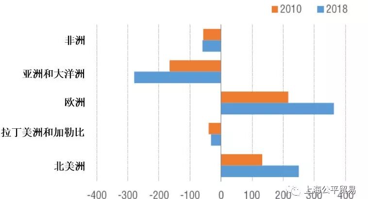 从服务贸易的贸易差额来看,欧洲和北美洲已经多年呈现顺差态势。而亚洲和大洋洲则持续逆差。非洲,拉丁美洲和加勒比海区域虽然有呈现逆差态势,但总体情况基本保持稳定。