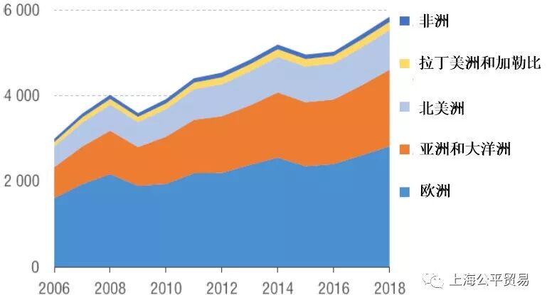 2018年,欧洲地区是服务贸易出口的主要目的地,占领了全球一半的市场,但是自从2005年欧洲失去了6%的市场份额,被新兴的亚洲市场代替。