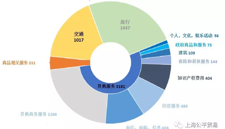 旅游服务出口额以1.437万亿美元占全球贸易总额的25%。其他商业服务占22%,交通运输服务则占17%。电信,计算机和信息服务也占据了较大的比重。