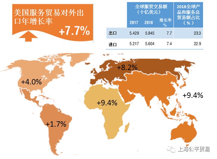 联合国贸易和发展会议(UNCTAD)于2019年5月28日发布国际服务贸易数据。根据其统计,2018年全球服务贸易出口总额5.845万亿美元,较上年增长7.7%,占2018年全球商品和服务贸易总额的23.3%;服务贸易进口总额5.604万亿美元,较上年增长7.4%,贸易总额占比为22.9%。其中按分类计,电信、计算机和信息服务出口额6060亿美元;按地域计,欧洲出口总额全球占比将近一半。美国进出口总额排名均为世界第一,中国出口额排名第五,进口额排名第二。