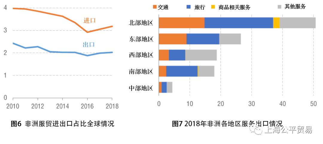 2010年至2016年,非洲在世界服务贸易的占比持续下降。然而,在过去的两年中,该趋势有所逆转,非洲的服务贸易规模在全球的占比略微有所增加。2018年,在非洲的绝大部分区域(除西部地区外)旅行服务占服务贸易出口份额最高。