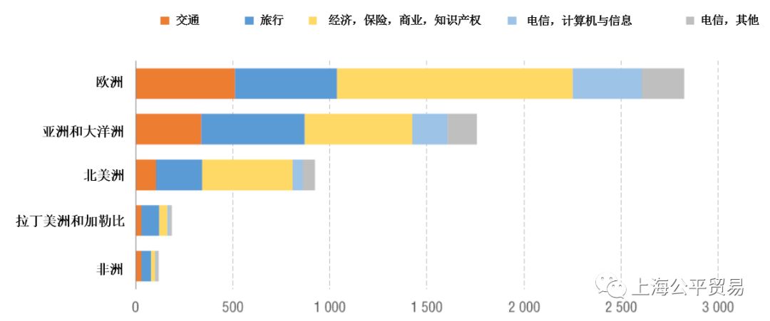 在以发达国家为主的地区,服务业贸易由金融服务和保险服务,以及各种商业和知识产权服务主导,特别是欧洲和北美地区,该趋势表现得尤为明显。在亚洲和大洋洲,前述的几类服务贸易领域出口额占全部服务贸易出口总额的31%。非洲和拉丁美洲的服务出口以旅行为主,分别占到42%和48%。