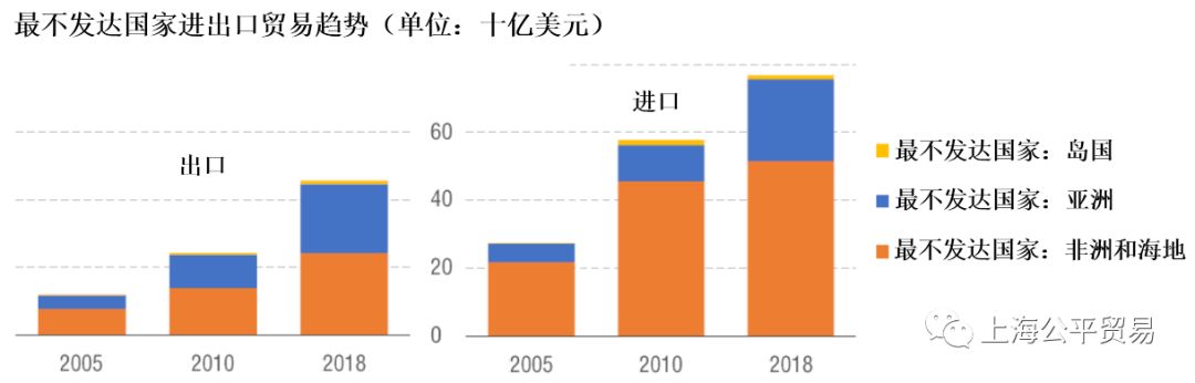 2018年,最不发达的国家(LDCs)服贸出口额占全球总服贸出口总额的比重不到1%,进口额占比则刚超过1%。2015年起,这些国家的服贸出口年增长率10%。同时他们的进口也以每年7%的速度增长。这些国家的服贸出口主要以旅游服务为主,占到这些国家全部服务贸易总额的43%。