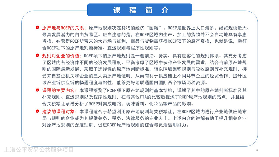 - 本讲内容适合于希望利用原产地规则与关税减让,在RCEP区域内进行产业链供应链布局与规则的企业或为其提供关务、税务、法律服务的专业人士,有助于其提升相关企业对原产地规则的深度理解,促进RCEP原产地规则的综合与灵活运用能力。