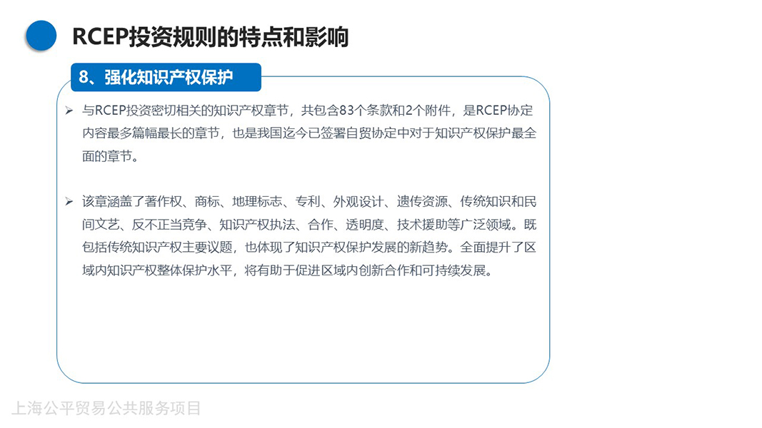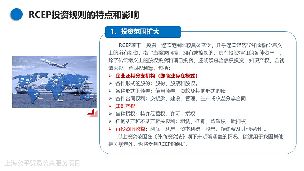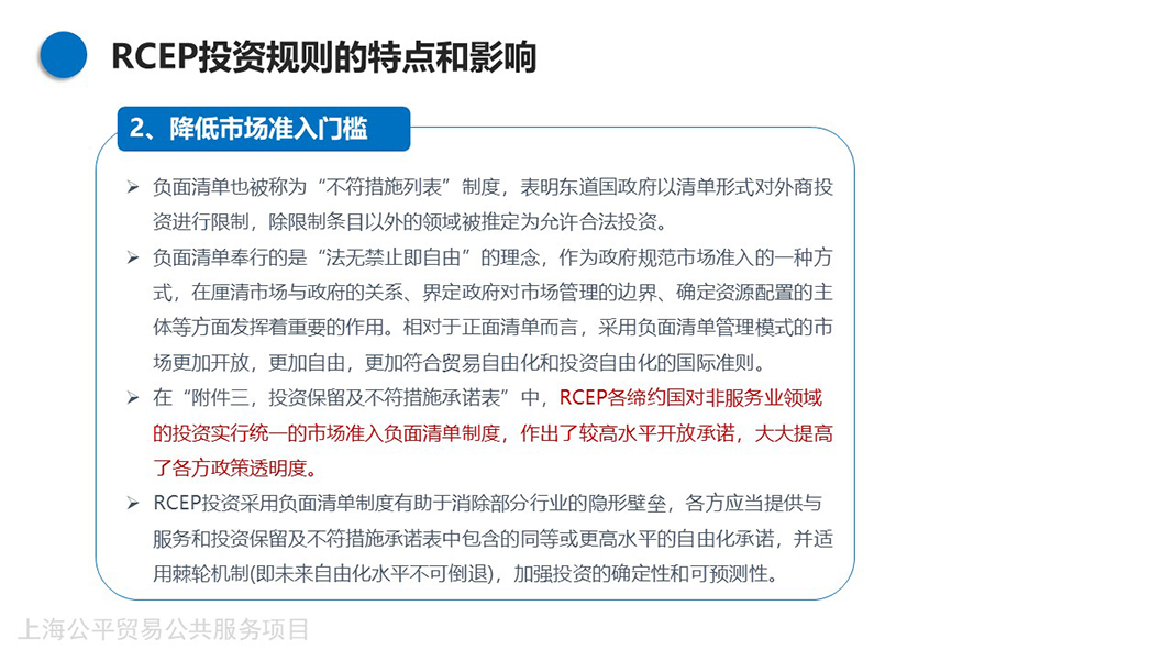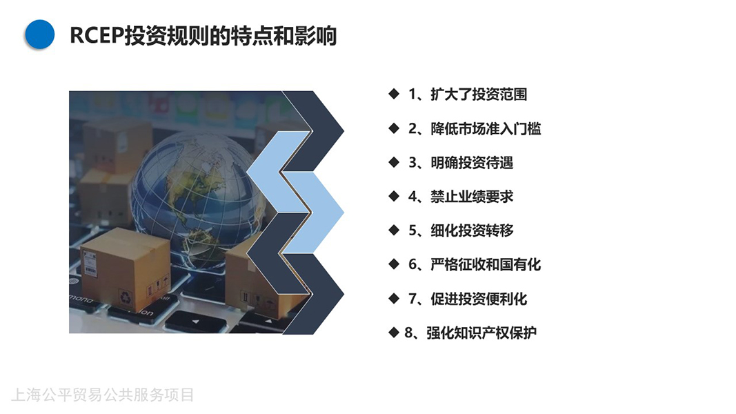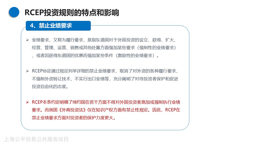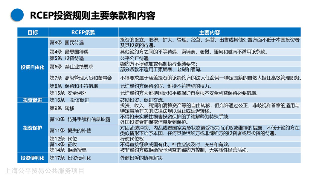 - RCEP区域是全球重要外国直接投资的目的地之一。RCEP投资规则在原“东盟‘10+1’自由贸易协定”投资规则的基础上进行了整合和升级,主要涵盖了投资保护、自由化、促进和便利化四个方面条款,充分体现了高标准的投资自由化与投资保护的最新趋势,具有扩大投资范围、降低市场准入门槛、明确投资待遇、禁止业绩要求、细化投资转移、严格征收和国有化、促进投资便利化、强化知识产权保护等显著特征,增加了承诺最惠国待遇、采用负面清单模式做出非服务贸易领域市场准入承诺并适用棘轮机制(即未来自由化水平不可倒退)等内容,为区域内投资者创造一个更加稳定、开放、透明和便利的投资环境。