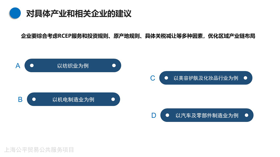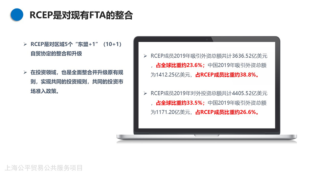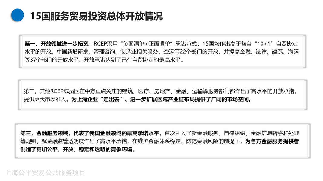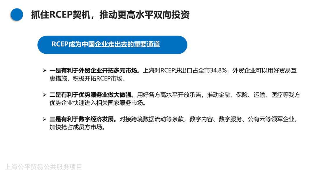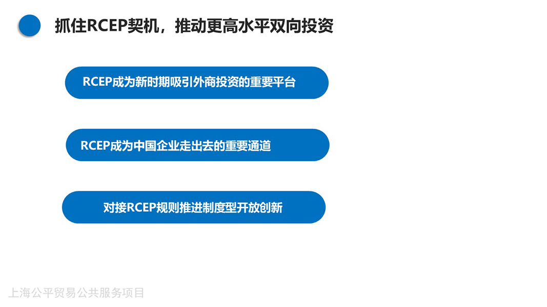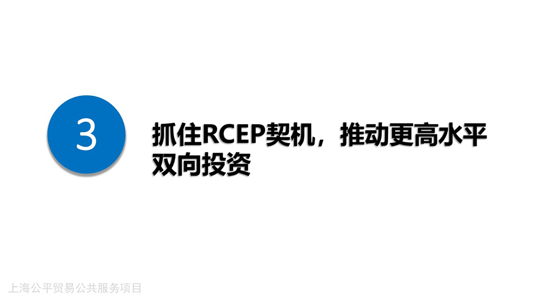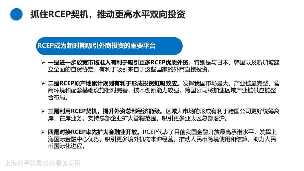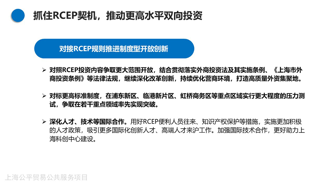 - 上海要加快对接RCEP,对标高标准自贸协定的投资规则,推动实现更高水平的扩大开放。一方面,RCEP成为新时期吸引外国投资的重要平台,要抓住RCEP契机,推动更高水平招商引资。另一方面RCEP也成为中国企业走出去的重要通道。我国企业要综合考虑RCEP服务和投资规则、原产地规则、具体关税减让等多种因素,利用好各国投资开放机遇,优化区域产业链供应链的高效布局,逐步提高在全球价值链上的地位。