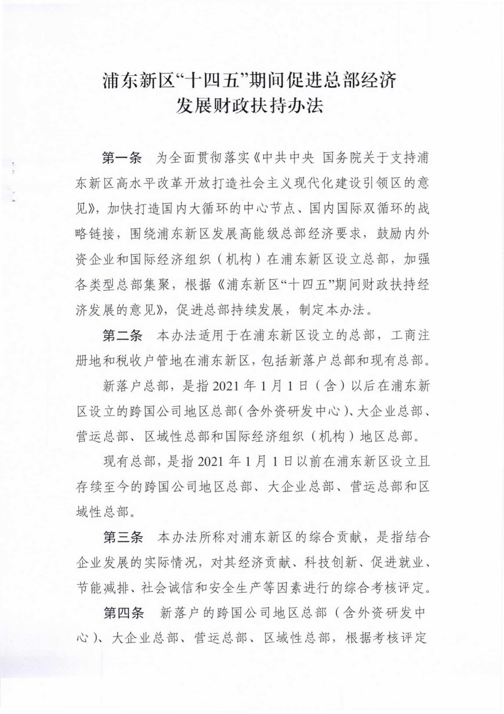 浦东新区“十四五”期间促进总部经济发展财政扶持办法
